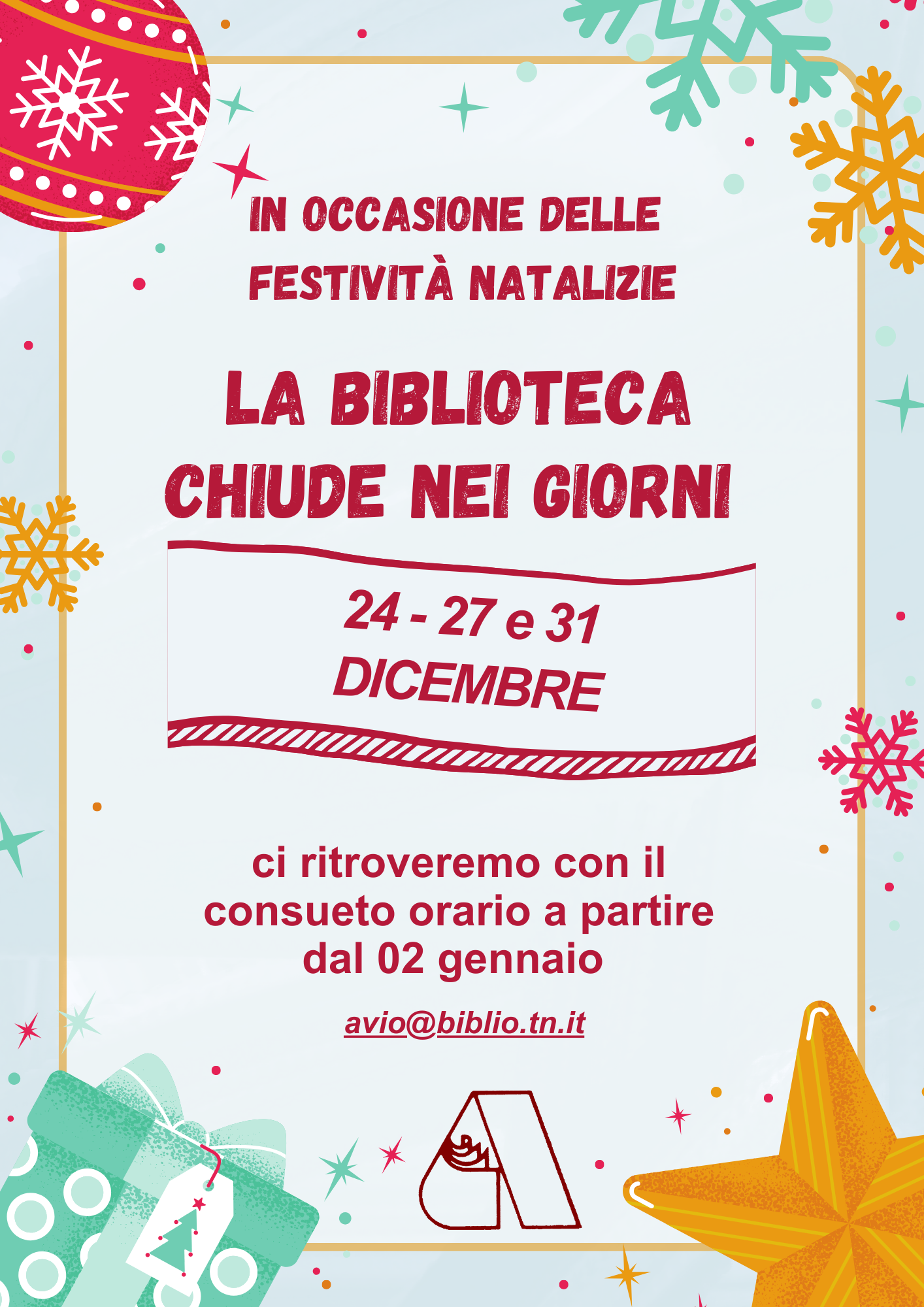 Descrizione La Biblioteca comunale chiude nei giorni 24, 27 e 31 dicembre.Riprenderà con il consueto orario il giorno 02 gennaio 2025.