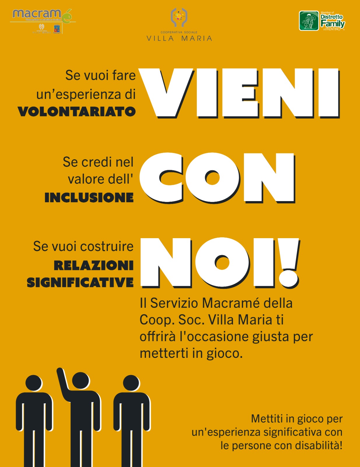 Descrizione Si pubblica la locandina della Cooperativa sociale Villa Maria per chi volesse fare un'esperienza di volontariato, credendo nel valore dell'inclusione e costruendo situazioni significative.