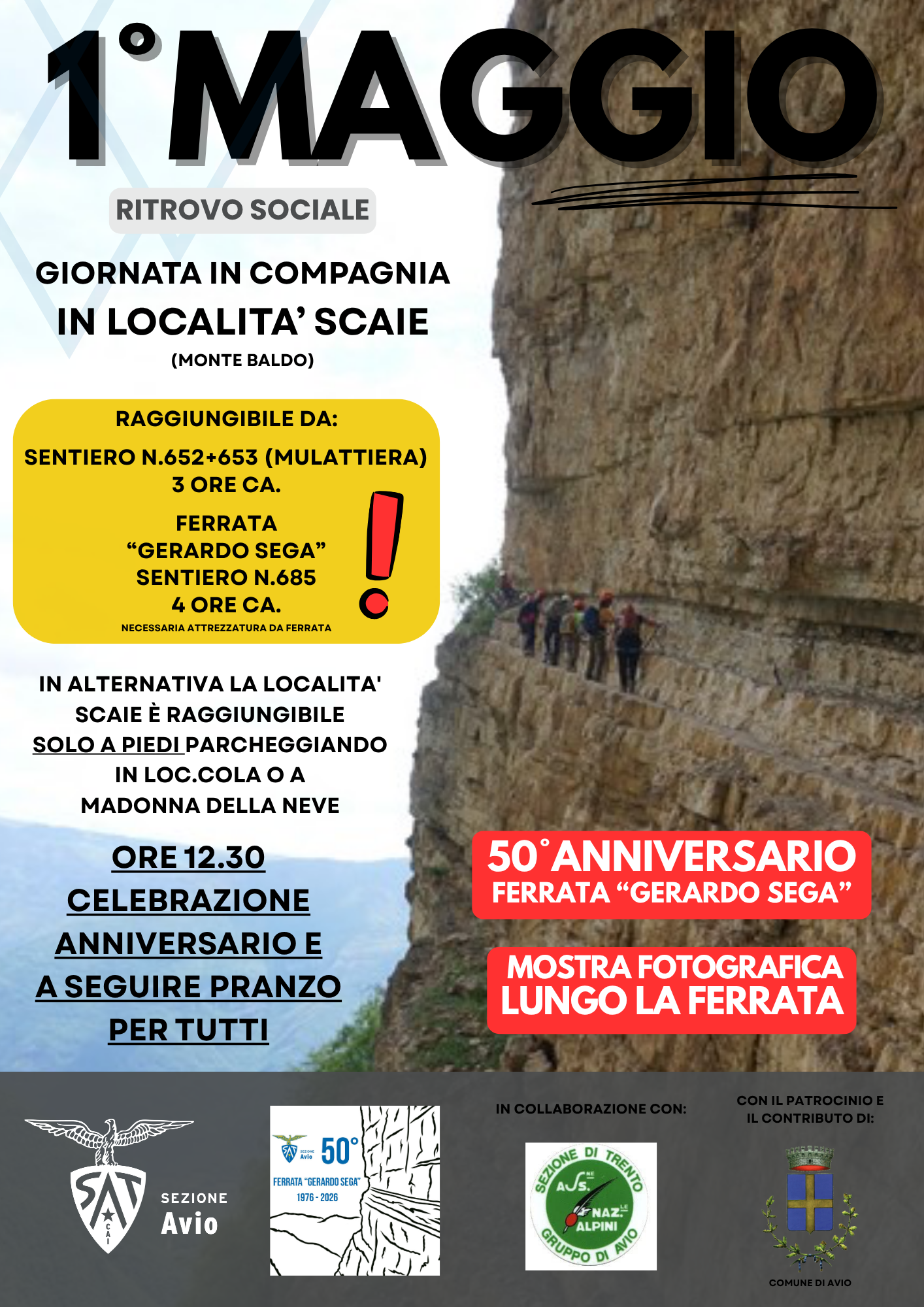 La sezione SAT di Avio, con il patrocinio e il contributo dell'Amministrazione comunale, organizza nella giornata di venerdì 01 maggio, il 50° anniversario della ferrata "Gerardo Sega" in località Scaie sul Monte Baldo.