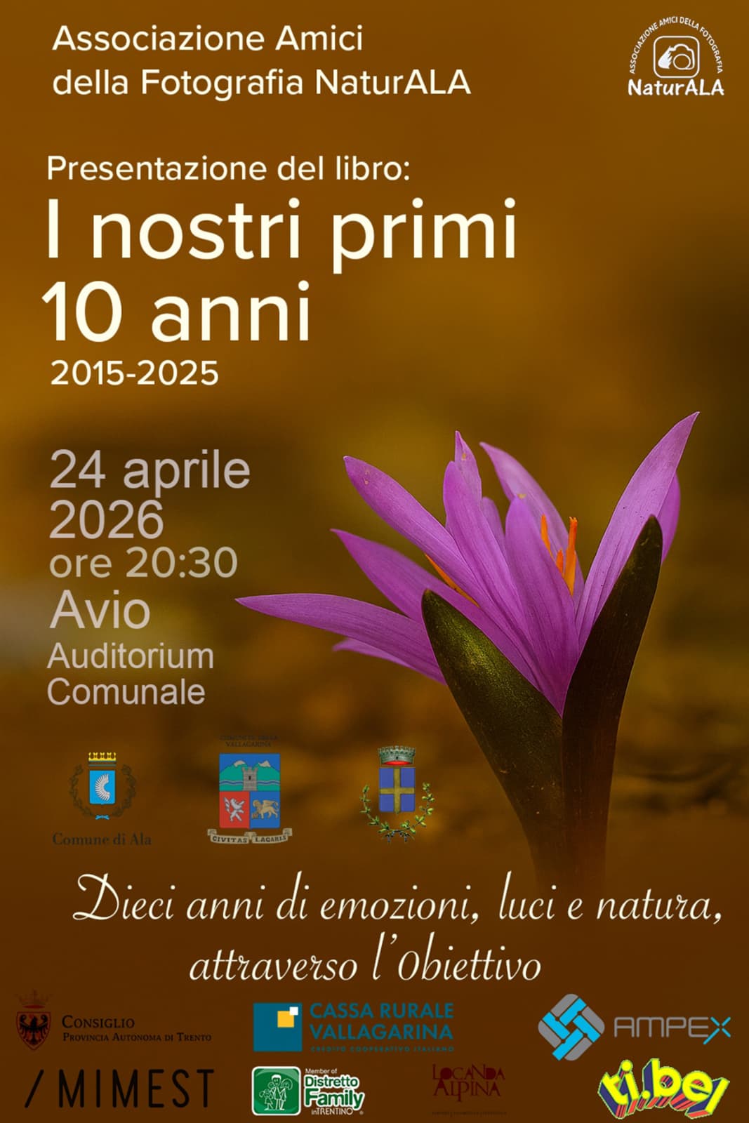 L'associazione Amici della Fotografia NaturALA, con il patrocinio del Comune di Avio, organizza la presentazione del libro "I nostri primi 10 anni" per rivivere e raccontare dieci anni di emozioni, luci e natura, attraverso l'obiettivo.