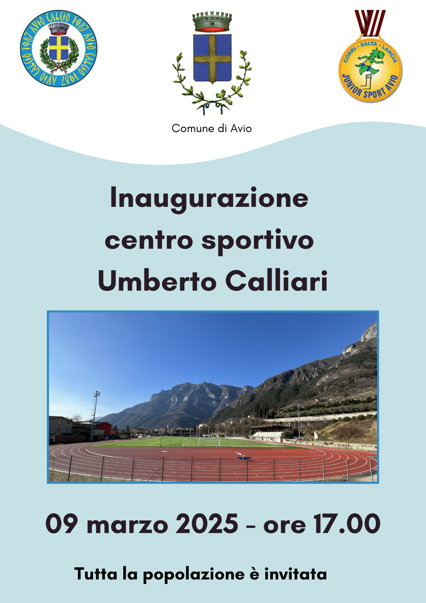 L'Amministrazione comunale, unitamente alle Associazioni Avio calcio e Junior sport invitano tutta la cittadinanza all'inaugurazione del centro sportivo Umberto Calliari prevista per domenica 09 marzo 2025 alle ore 17.00.