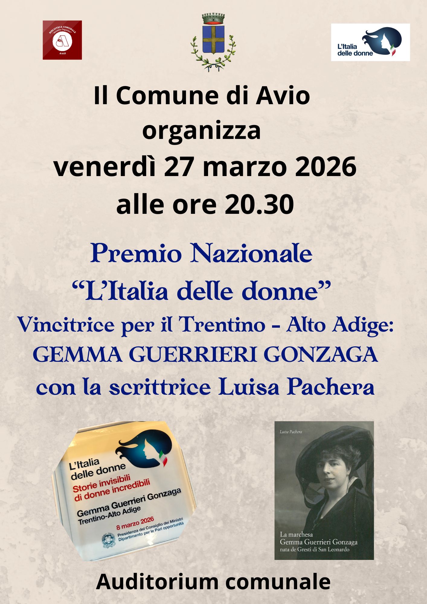 Il Comune di Avio organizza venerdì 27 marzo 2026 alle ore 20.30 una serata di presentazione del Premio Nazionale "L'Italia delle donne" con il quale è stata premiata la candidatura della marchesa Gemma Guerrieri Gonzaga, presentata dal Comune di Avio nell'ambito della seconda edizione del bando "L'Italia delle donne" della Presidenza del Consiglio dei Ministri.