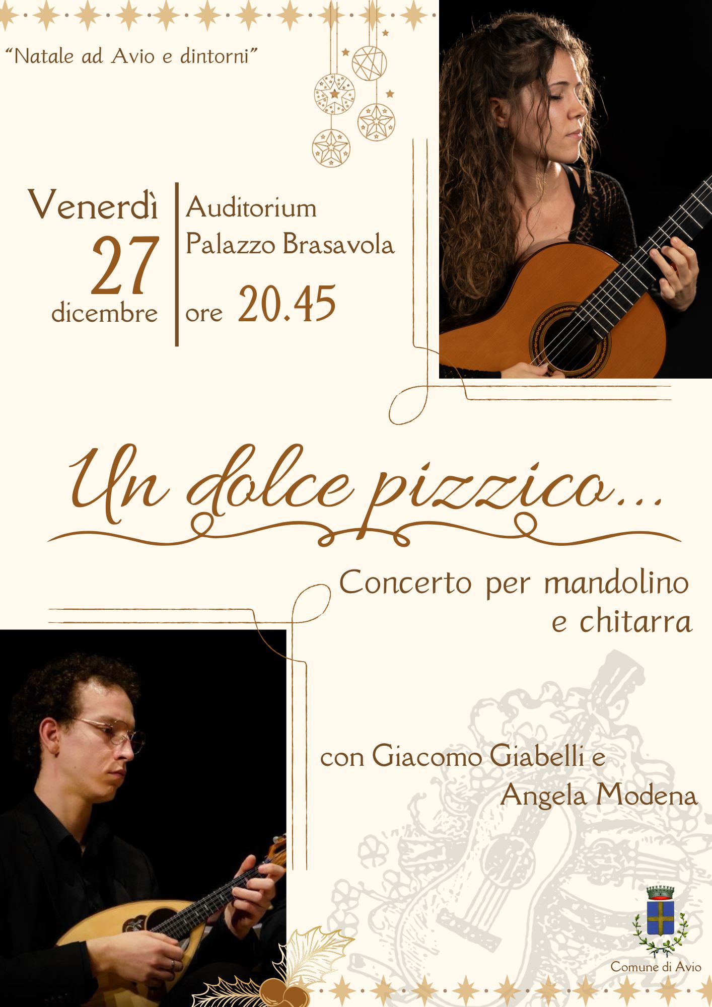 L'Amministrazione organizza, nell'ambito del programma natalizio degli eventi previsti ad Avio e dintorni, il concerto per mandolino e chitarra "Un dolce pizzico..." con Giacomo Giabelli e Angela Modena, venerdì 27.12.2024 alle ore 20.45 in Auditorium.